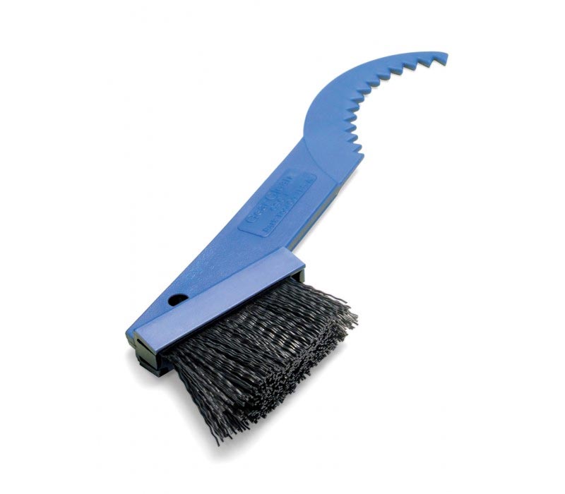 The Park Tool GSC-1 GearClean Brush has a unique design. A large comfortable handle with a curved, toothed-end reaches dirt deep between the gears, and tough nylon bristles clean the derailleur and chain. Saves wear and tear on your chain and freewheel. Works great on brakes or other places where dirt collects.