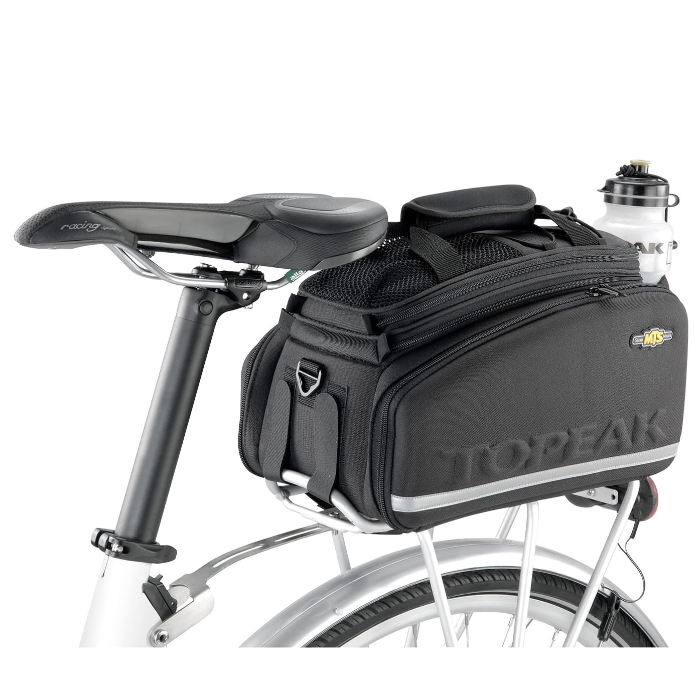 Dual molded side panels combine with flexible 600 denier fabric to form a semi rigid, weather resistant trunkbag. Divided main compartment and side panels expand for extra storage capacity. Rear water bottle holder lets you carry more water on extended trips. Attaches with integrated straps. Pannier deployment requires a beam rack with side frames attached or a traditional rack with struts to prevent panniers from contacting rear wheel.